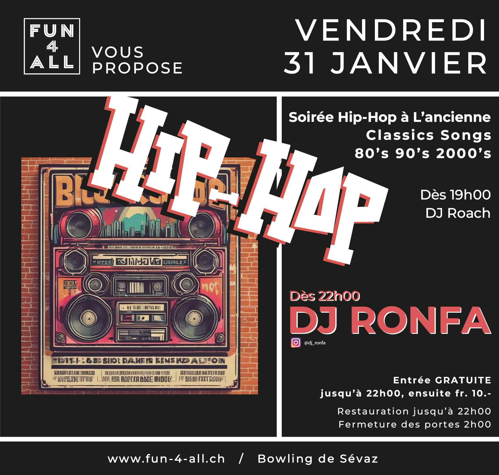 Le vendredi 31 janvier, Fun 4 All vous invite à une soirée Hip-Hop rétro au Bowling de Sévaz ! Vibrez sur les classiques des années 80, 90 et 2000 avec DJ Roach dès 19h, suivi de DJ Ronfa à partir de 22h pour enflammer la piste.